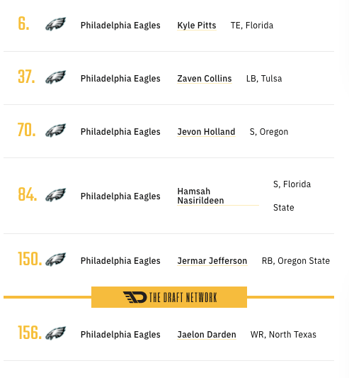 The top 15 of this draft is very deep so I would shop the pick and see what teams are offering. Roseman should be trying to get as much young talent as possible and trading out of the top 10 would be the quickest way to do that. In the scenario above, we trade back to 12 with San Fransisco while they also send their second and third round picks from this year. The Eagles would walk away with Rashawn Slater, who’s still a premium talent in the trenches plus five more top 100 guys. With value like that available, I could see the Eagles trading back all the way to 15 with New England. In the past, teams have even been willing to part with future first round picks in order to grab a player they really like. If a team like the Patriots is offering a future first to get into the top ten then the Eagles should be all ears. The Colts pick from the Wentz trade is conditional, which means it could turn into a first round pick as well. The thought of going into the 2022 draft with three potential first round picks should be very intriguing to the Eagles front office, especially if Jalen Hurts were to struggle in 2021. I would give Jalen a shot in 2021 and if he struggles then you have the draft capital to go get your guy in 2022. However, he could also prove he’s your franchise guy and now you’d have three first round picks to build around him. I think multiple teams will call about the sixth pick and the Eagles should be listening to all offers.