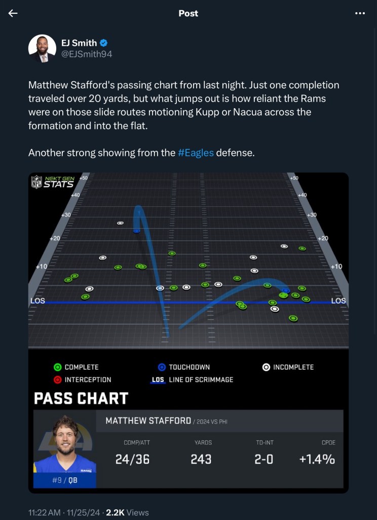 The Eagles held the Rams to 0-8 on third downs on the night, which brings their opponents conversion total over their last four games to an impressive 9-44. Philadelphia also held Matt Stafford to his lowest passing total since week six.