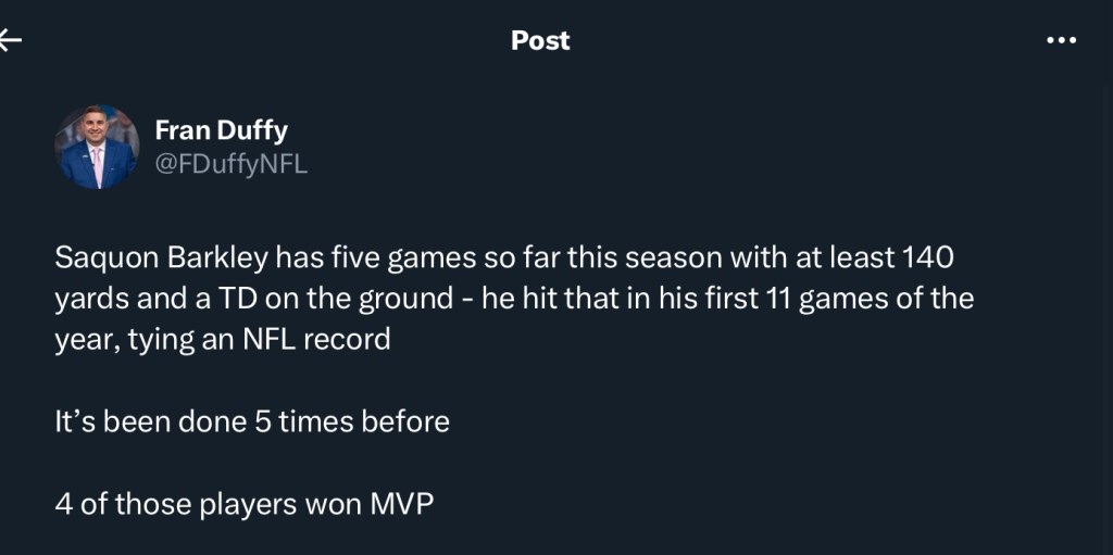 While there have been a few players to come close, the Eagles haven’t had a player win the MVP award since Norm Van Brocklin in 1960. Whether Barkley ends the drought remains to be seen, but he is currently listed with the fourth-best odds to win following his massive performance.