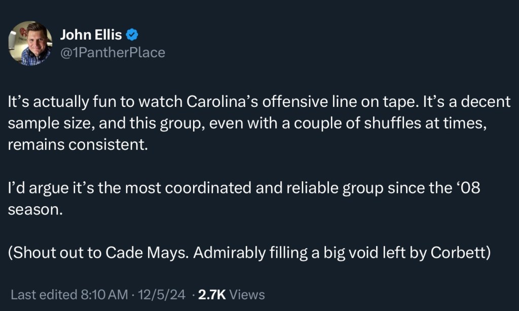 Don’t let the record fool you, while there are many things about this about this Panther roster that are in need of improvement, the offensive line has offered a bit of a bright spot this season. With the group starting 11 players across all five positions just a season ago, the goal was to bring a sense a stability heading into this season.