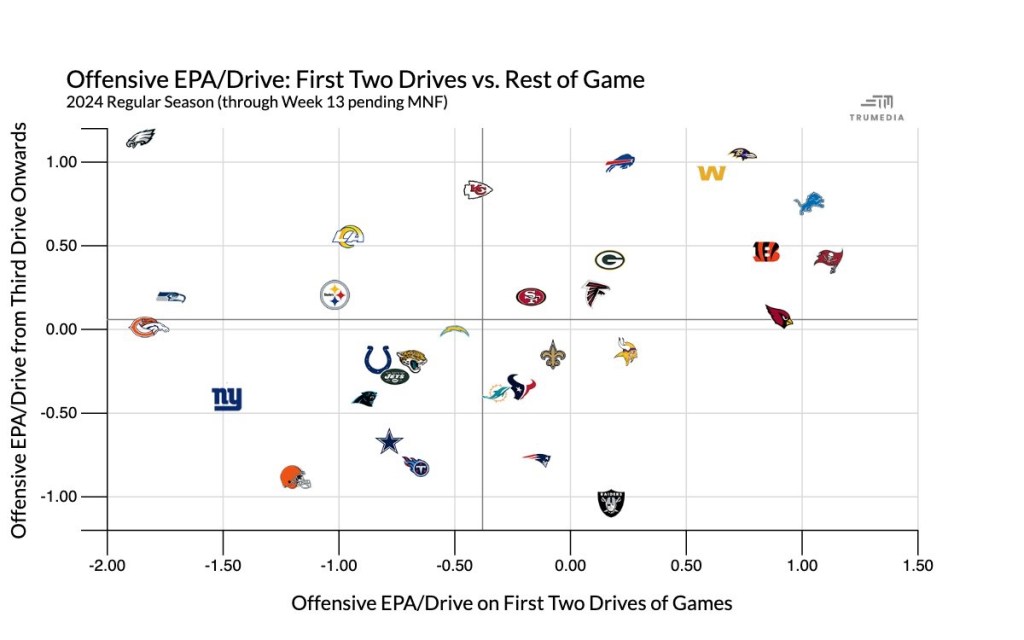 What makes matters even more interesting is the fact that the team has the worst production in the league through their first two possessions in terms EPA per drive.